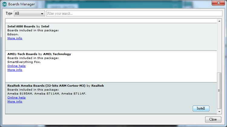 將捲軸往下拉找到 “Realtek Ameba Boards”,點右邊的Install,這時候Arduino IDE就根據Ameba的設定檔開始下載Ameba所需要的檔案: