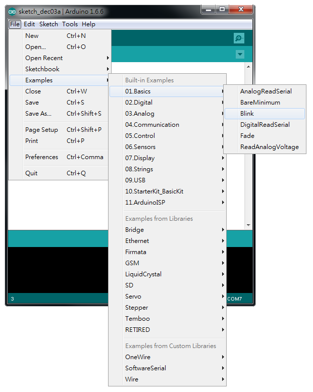 打開 "File" -> "Examples" -> "01.Basics" -> "Blink"
