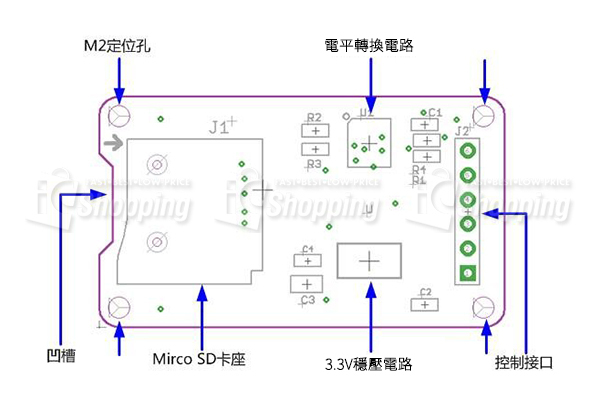 定位孔:4個M2螺絲定位孔,孔徑為2.2mm,使模組便於安裝定位,實現模組間組合。