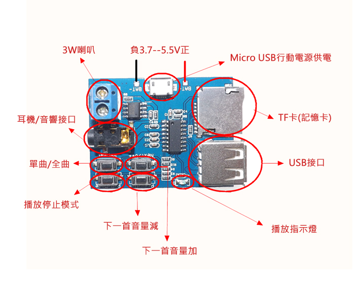 1.支援MP3格式,上電自動播放,播放狀態時紅色LED指示燈更新。
