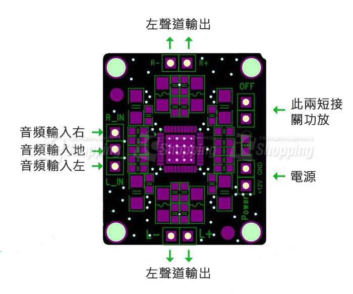 本功放板採用官方標準電路設計而成,晶片選型採用的是美國進口原裝龍鼎微D類功放晶片。