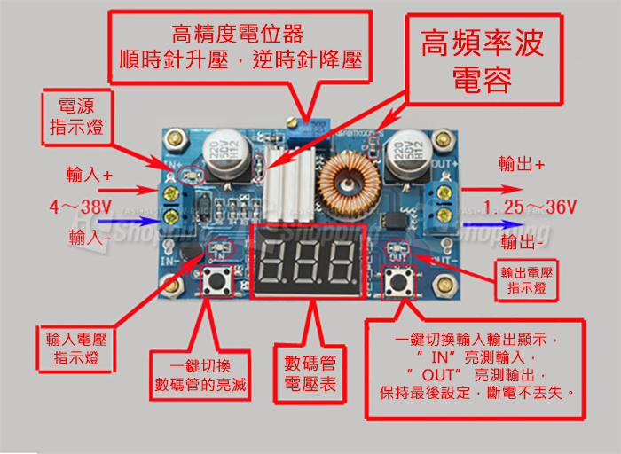 ※有客戶反映模組輸出電壓不能調節,總是與輸入電壓相等。當您遇到這種問題時,請先逆時針旋轉電位器10圈以上,再使用模組就可以正常調節電壓了。因為該降壓模組出廠時,預設輸出電壓在20V左右。