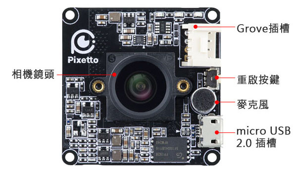 Pixetto為一款高畫質視覺感測器,涵蓋物體、形狀、顏色、人臉及手寫辨識等功能,並搭配機器學習,提供直觀且互動性平台以進行人工智慧與機器學習操作,進而探索更多先進技術的可行性應用。