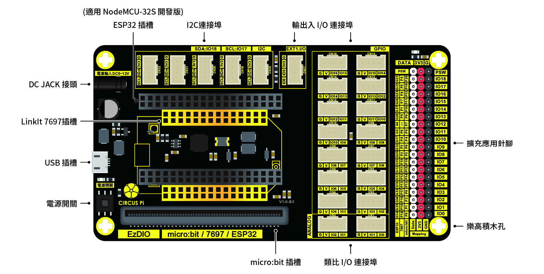 EzDIO是Circus Pi專為Easy學習系列,設計的第三塊擴充板。承接了原先的簡單使用、相容性高、擴充性佳...等元素,除了大小與EZ Start Kit/EZ Start Kit+一樣大之外,同樣保留了可單獨連接micro:bit、LinkIt 7697、ESP32 (適用 NodeMCU-32S 開發版)這三塊控制板,並於擴充板四角設計符合LEGO間距的十字積木插孔。