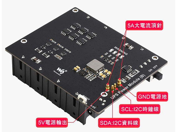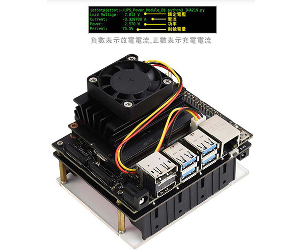 可通過 I2C 連接埠通信,測量電池電壓、電流、功率和剩餘電量等參數,檢測到電壓過低時,可以使用程序控制樹莓派,保存資料後再關機,避免 Jetson Nano 突然斷電而導致資料遺失