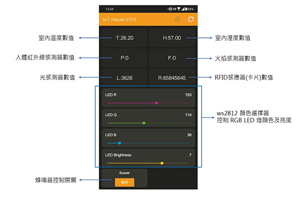 透過目前學生常用感測模組模擬未來智慧屋操作狀況,且能透過手機APP即時查看調整屋內狀況。