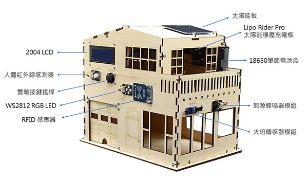IoT智慧屋就是模擬一個將所有東西都串連起來,能用手機或網頁觀看光照、室內溫度與濕度,或是家中門禁狀態……等各項數據,同時能操控自家電燈開關、警報器(蜂鳴器)等裝置的智慧房屋。