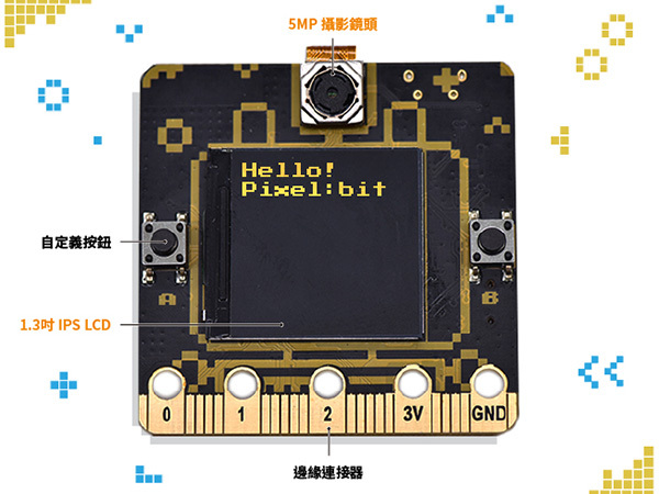 Pixel:Bit 開發板是 CIRCUS Pi 全新概念的產品,我們將 ESP32 CAM 重製為類似 micro:bit 的造型,可相容於相關應用產品。此板還保留了 Micro SD 卡擴充的功能,選用 500 萬像素的 OV5640 Camera 模組,拍攝影像/蒐集圖像資料,畫面更清晰,另有 1.3 吋的彩色 LCD 可用於顯示文字資訊/鏡頭拍攝到的畫面!