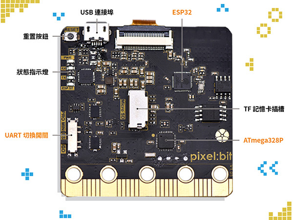 Pixel:Bit 開發板是CIRCUS Pi 全新概念的產品,我們將 ESP32 CAM 重製為類似 micro:bit 的造型,可相容micro:bit 相關應用產品。Pixel:Bit 保留了 Micro SD 卡擴充的功能,更升級 ESP32 CAM 攝影鏡頭部份。