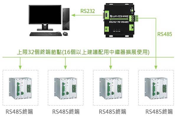 | 傳輸模式:點對多(至多32個節點,16個節點以上建議加中繼器) | |