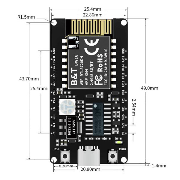 BW16-Kit 是為 BW16 模組設計的開發板。 BW16是雙頻B&T基於RTL8720DN芯片開發的Wi-Fi+藍牙SoC模組。 BW16支援雙頻(2.4GHz或5GHz)WLAN和低功耗藍牙5.0,集成 ARM V8(兼容Cortex-M4F)高性能MCU、ARM V8M(兼容 帶 Cortex-M0) 低功耗 MCU、WLAN (802.11 a/B/g/n)、MAC、藍牙基帶和 RF 基帶,並提供一組可配置的 GPIO 端口,用於控制不同的外圍設備。