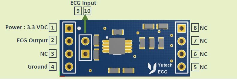 | 9,10 | ECG Input | 9號腳位 上 接至心電電極正端; 10號腳位 下 接至心電電極負端。 |