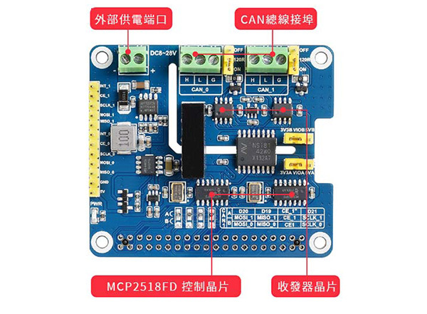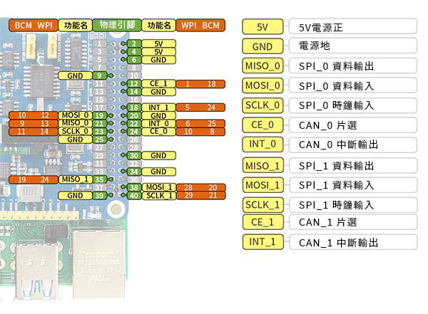 | 1 | MCP2518FD控制晶片 | 7 | RasberryPi GPIO連接埠 |