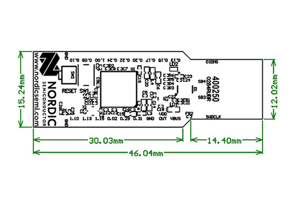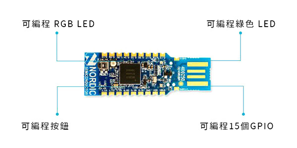 它受大多數nRF Connect For Desktop應用程序支援,並將根據需要自動編程。此外還可以製作自定義應用程序並將其下載到Dongle。它具有用戶可編程的RGB LED、綠色LED、用戶可編程按鈕以及15個GPIO,可沿邊緣的蜂窩狀焊點。範例程式在nRF5 SDK中以電路板 PCA10059提供。