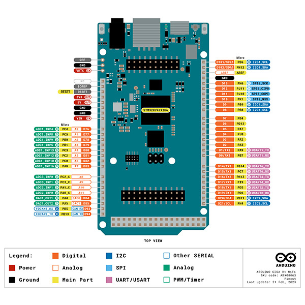 GPIO 和額外的引腳:我們希望保持與 Mega 和 Due 相同的外形尺寸,這樣您就可以輕鬆地將定制的防護罩調整到 GIGA R1 WiFi(不過請記住,該板在 3.3V 下工作!)並且我們添加了額外的接頭連接器 訪問額外的引腳,將總數留給 76 個 GPIO 引腳,最好的部分是,您可以從下面訪問它們,所以保持項目原樣,只考慮如何擴展它。 此外,我們還添加了兩個新引腳:一個 VRTC,可以連接電池以在電路板關閉時保持 RTC 運行;另一個 OFF 引腳,可以關閉電路板。