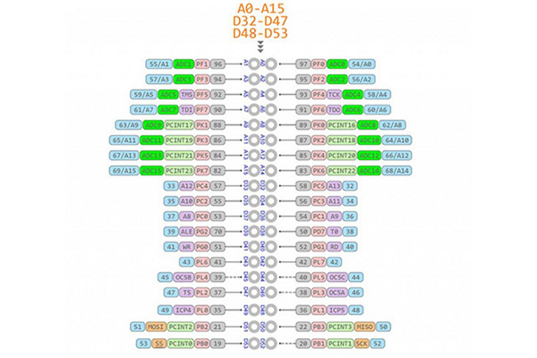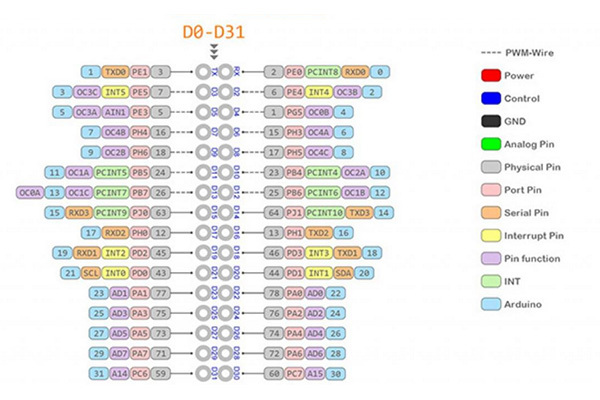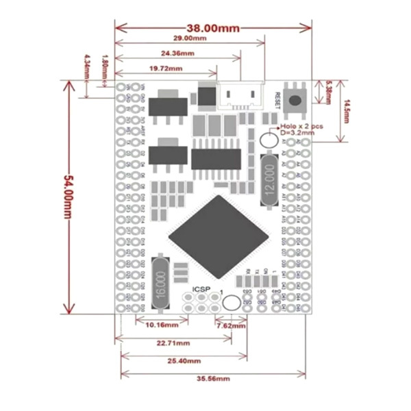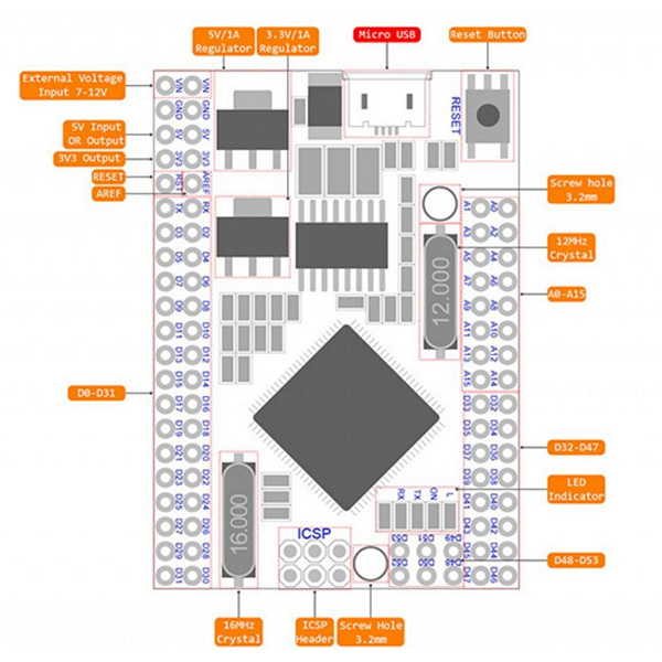 主板功能類似於Arduino Mega 2560.它是嵌入式主板,並採用原裝晶片ATmega2560(16 MHz)。