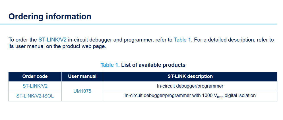 ST-LINK/V2 是一款適用於 STM8 和 STM32 微控制器的線上偵錯器和程式設計器。 單線介面模組 (SWIM) 和 JTAG/序列線調試 (SWD) 介面用於與應用板上的任何 STM8 或 STM32 微控制器進行通訊。 除了提供與 ST-LINK/V2 相同的功能外,ST-LINK/V2-ISOL 還具有 PC 和目標應用板之間的數位隔離功能。 它還可承受高達 1000 Vrms 的電壓。