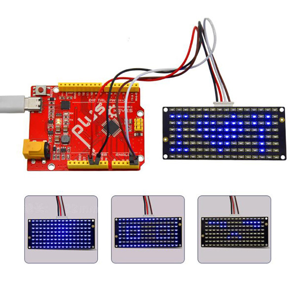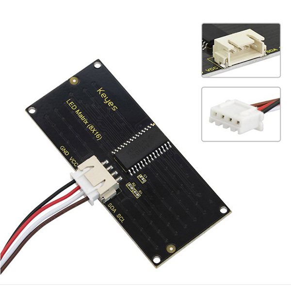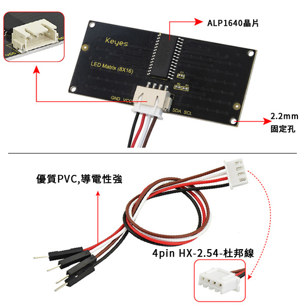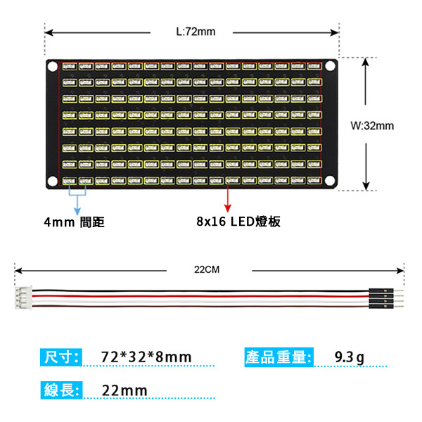 燈板自帶128個LED燈,ALP1640晶片。我們可以透過單片基和該模組進行I2C通訊,通過控制AIP1640晶片,控制模組上128個LED燈的亮跟滅。