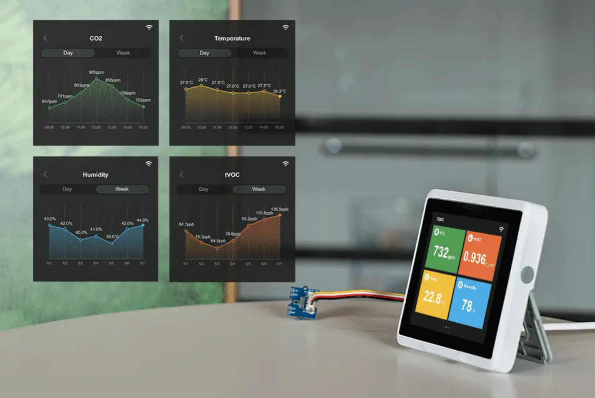 SenseCAP Indicator 本機硬體使您能夠將其用作桌面空氣質量檢測器,或者您可以自定義一種自己的樣式。 內建tVOC和CO2感測器,並提供Grove TH感測器外接,減少熱干擾,得到更準確的溫濕度結果。