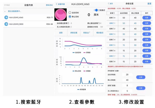 通過APP搜索附近的雷達設備,設備的廣播名"HLK-LD2410B_XXXX"(XXXX是後4位MAC地址),連接成功後可察看雷達訊息和設置參數