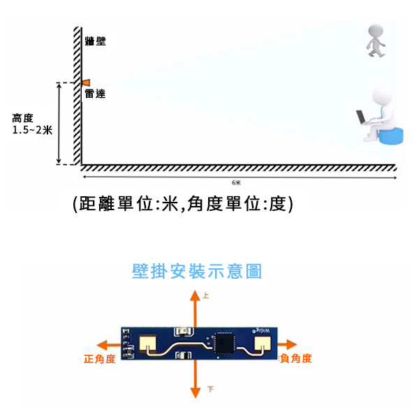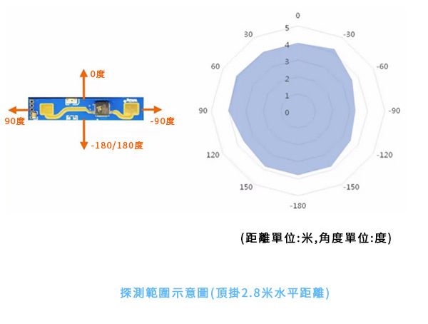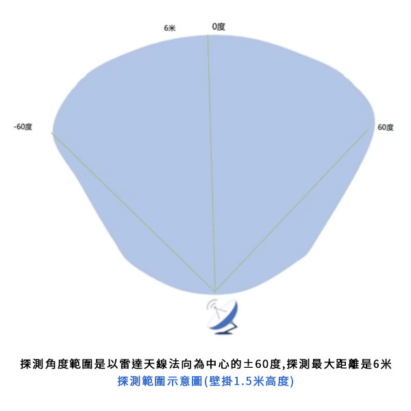 產品主要應用在室內場景,感知區域內是否有移動或者微動人體,實時輸出結果。最遠感應距離可達6米,解析度0.75m。提供配置工具,可配置感應距離範圍、不同區間的感應靈敏度和無人延時時間等。