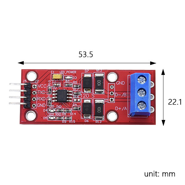 模組建議使用5V供電(因485訊號電平範圍為2-6V,故而3.3V供電遠距離可靠性降低),使用3.3V和5V訊號控制都可以(註:電源使用5V,訊號使用3.3V支援,已經做了訊號保護,請放心)
