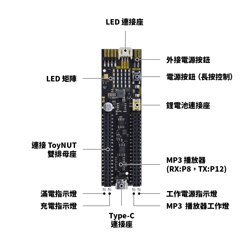 PowerCORN 擴展板可搭配專用鋰電池進行使用,電池容量為 800ma,不須額外外接電源,板載穩壓模組最大可提供提供 5V3A 的電力,並能使用擴展板的 USB Type-C 接口對鋰電池進行充電和音樂檔案的數據傳輸,足以滿足各種互動玩具專案和課程應用。