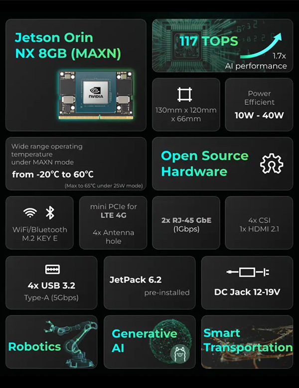 | 人工智慧效能 | Orin NX 8GB – 117 TOPS(MAXN) | Orin NX 16GB – 157 TOPS(MAXN) |
