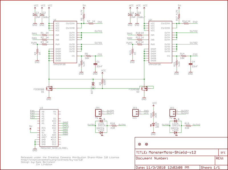 This is essentially a ramped up version of our Ardumoto motor driver shield. For this SparkFun Monster Moto Shield we’ve replaced the L298 H-bridge with a pair of VNH2SP30 full-bridge motor drivers. We’ve also beefed up the support circuitry so this board is capable of driving a pair of high-current motors! The VIN and motor out are pitched for our 5mm screw terminals (not included), making it easy to connect larger gauge wires.