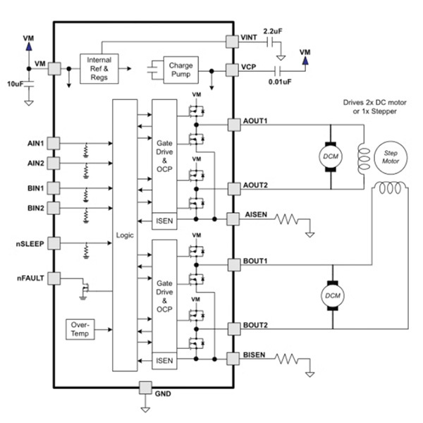 邏輯電源電壓 (VCC) 的範圍為 2.7-5.5VDC,而馬達電源 (VM) 的最大電壓限制為 15VDC。每個通道的額定輸出電流高達 1.2A(短單脈衝高達 3.2A)。