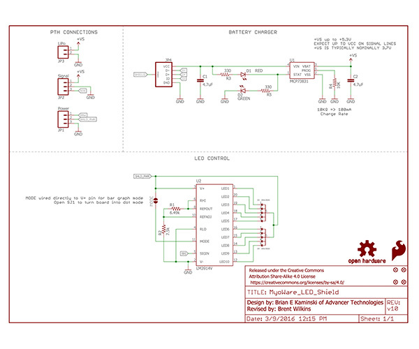 此屏蔽很可能是堆疊中的頂板,因此焊接一些 1x3 公頭並插入感測器板。電源由 LED 屏蔽提供,但由感測器上的電源開關控制。一旦組裝好堆疊,就扣上一些電極並將感測器粘在目標肌肉上。此屏蔽所連接的 MyoWare 肌肉感測器是 Advancer Technologies 生產的由 Arduino 供電的一體式肌電圖 (EMG) 感測器。 MyoWare 板透過測量肌肉的濾波和整流電活動來發揮作用,根據所選肌肉的活動量輸出 0-Vs 伏,其中 Vs 表示電源電壓。