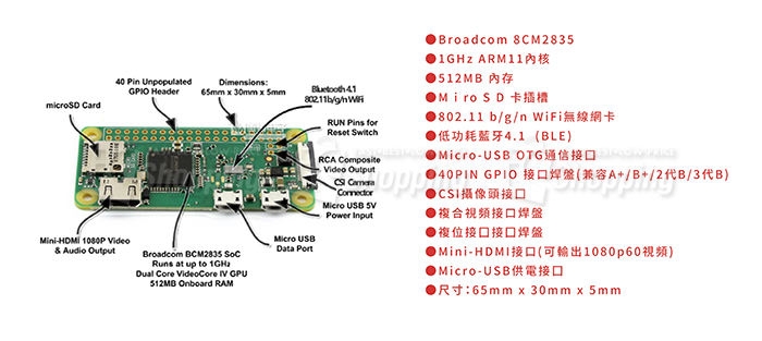 核心處理器採用與 B+、A+ 相同的 1GHz BCM2835 單核心處理器,搭配 512MB RAM。整體效能比初代 Raspberry Pi 快上約四倍,價格卻僅為 Raspberry Pi 3 的一小部分。