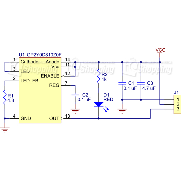 A red LED on the back of the PCB lights when the output is low, indicating that the sensor is detecting something. If so desired, you can disable this LED by cutting the trace between it and the OUT pin where it is marked on the silkscreen or by desoldering the LED.