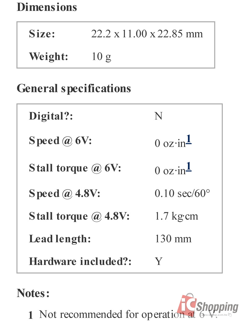 | Stall torque @ 4.8V: | 1.7 kg·cm |