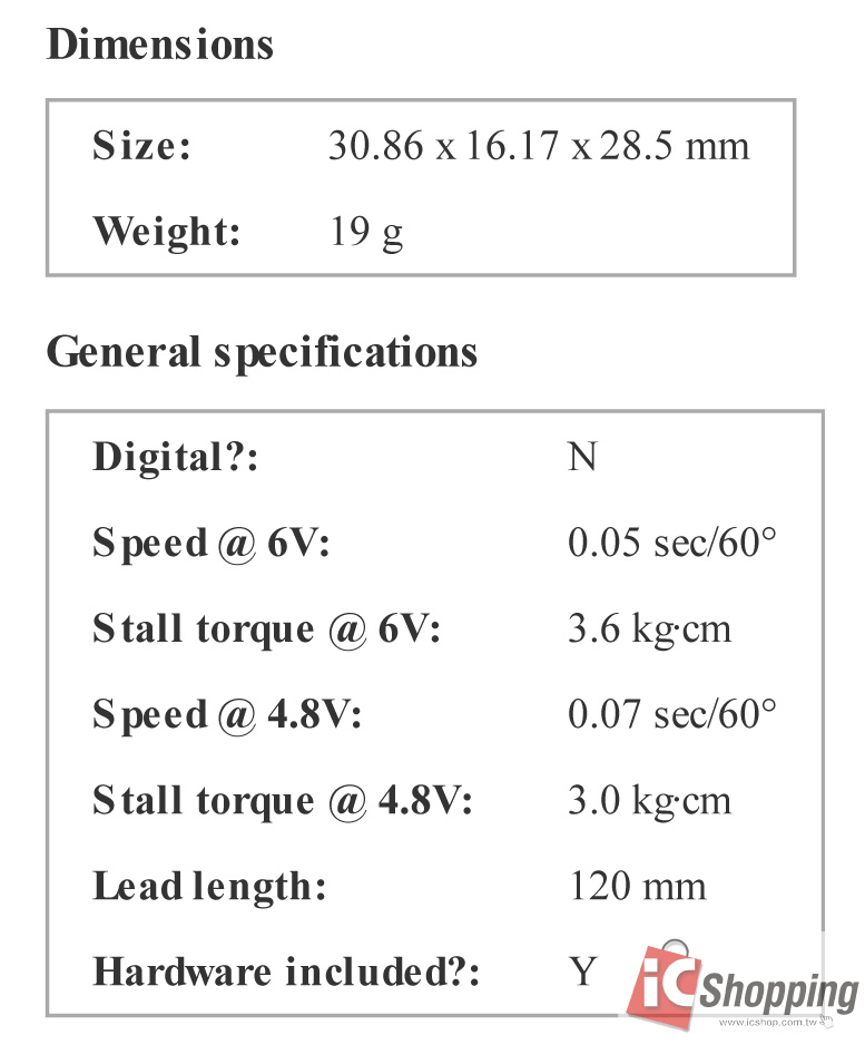 | Stall torque @ 6V: | 4.4 kg·cm |