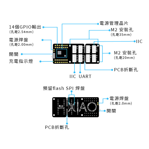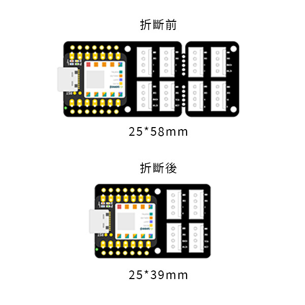 借助板載電池管理晶片和電池焊盤,您可以輕鬆地使用 3.7V 鋰電池為您的 Seeed Studio XIAO 供電並為其充電,使您的項目,尤其是可穿戴設備,更加靈活和便攜。 您甚至可以根據您的項目實際需要通過板載PCB壓印支架將電路板折斷(折斷後尺寸僅為25 * 39mm),使其更小。