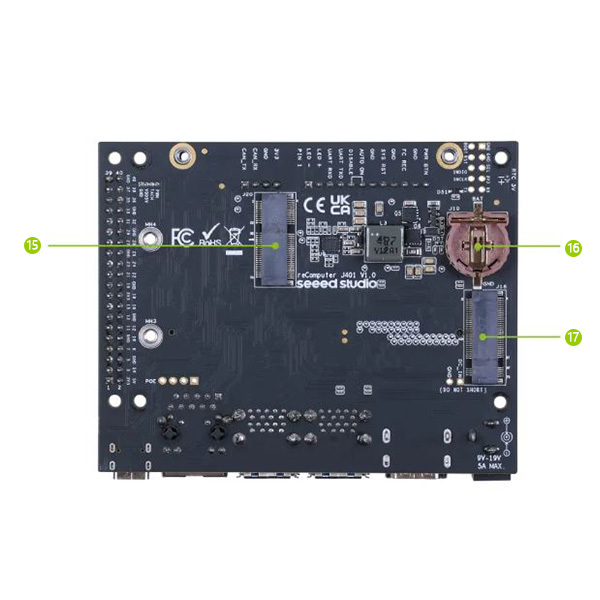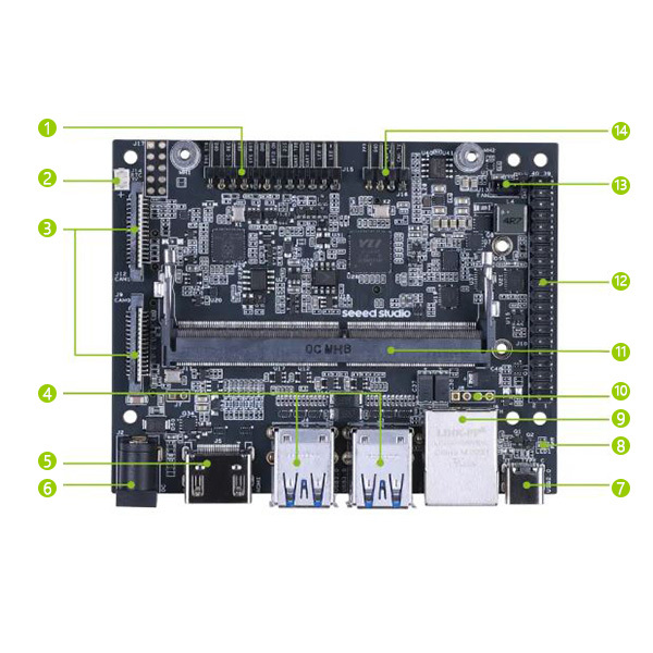 reComputer J4012的Seeed載板是一款高性能、接頭豐富的闆卡,提供HDMI 2.1、千兆乙太網、USB 3.2、M.2 key E、M.2 key M、CSI攝像頭、CAN、GPIO、I2C、I2S、 風扇等豐富的外設接頭。