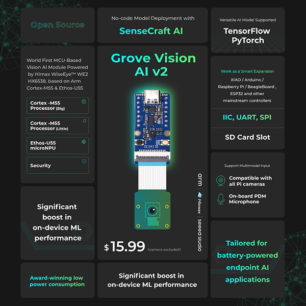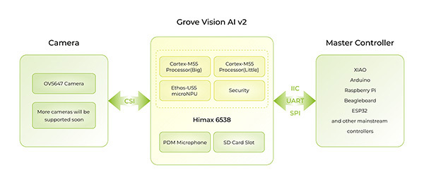 Grove - Vision AI V2 是一款基於 MCU 的高效智慧視覺模組,由 Himax WiseEye2 HX6538 處理器驅動,具有雙核心 Arm Cortex-M55 和整合的 Arm Ethos-U55 神經網路組件。 它整合了針對向量資料處理進行了精細優化的 Arm Helium 技術,可在不影響功耗的情況下顯著提升 DSP 和 ML 功能,非常適合電池供電的應用。