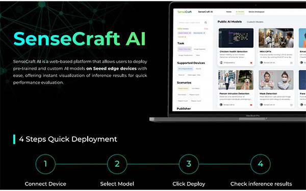 SenseCraft AI 非常適合tinyML 應用,透過 Grove Vision AI V2 將視覺 AI 添加到您的智慧感測器中變得非常容易。 透過連接裝置、選擇模型並查看識別結果,輕鬆部署現成或自訂 AI 模型。