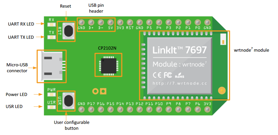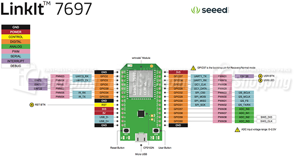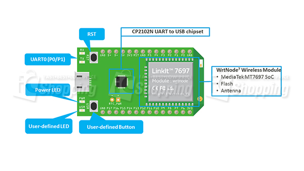 MediaTek MT7697 家族晶片是一款高度整合式系統單晶片(SoC),配備應用處理器,支援低功耗的1T1R 802.11 b/g/n Wi-Fi,具有藍牙子系統、電源管理單元。應用處理器的子系統搭載具有浮點運算單元的ARM® Cortex®- M4,也支援許多週邊介面,包括:UART、I2C、SPI、I2S、PWM、IrDA、輔助ADC,以及嵌入式SRAM/ROM。