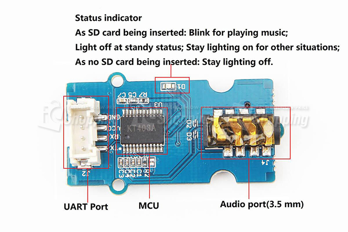 Grove - MP3 v2.0 是一款小巧緊湊的音訊模組。支援WAV、WMV等多種音訊檔案的隨機播放、依序播放等操作。透過串行通信,您可以使用所有預定義命令甚至它們的組合來播放音樂。本模組也支援FAT16和FAT32等通用檔案系統。它有一個 Grove UART 介面、一個 3.5 毫米音訊插孔和一個 micro-SD 插槽。透過此模組,您可以為靜音應用程式獲得一些“聲音”。