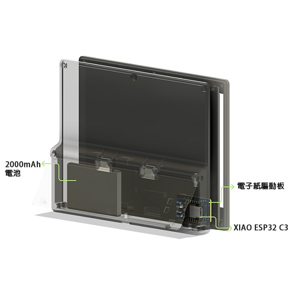 由 3.7V 2000mAh 可充電鋰離子電池供電,在深度睡眠模式(6 小時刷新間隔)下,一次充電可運行長達 3 個月。無眩光電子墨水顯示器可確保在任何光線條件下清晰可讀,同時減輕眼睛疲勞。