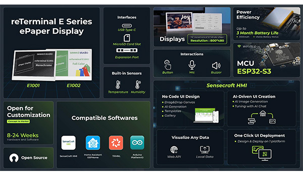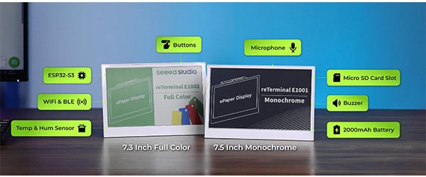 reTerminal E1001 是一款完全組裝的 HMI(人機介面),採用時尚耐用的外殼,整合 7.5 吋 800×480 單色電子紙顯示器。它搭載樂鑫 ESP32-S3 晶片,開箱即用,帶來驚豔的視覺效果,無需額外設定。