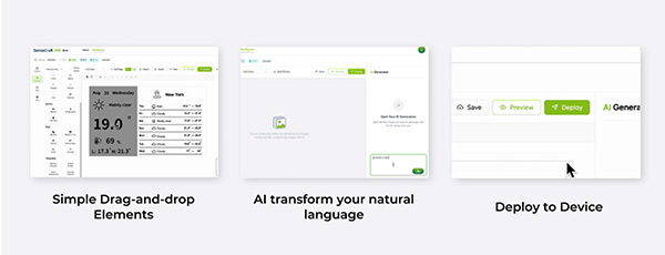 使用我們全新 AI 驅動的無程式碼平台 SenseCraft HMI,輕鬆設計和部署個人化儀表板。您可以透過簡單的拖放元素來建立您的 UI,從我們豐富的範本中進行選擇,或讓 AI 為您提供協助。連接來自板載感測器或 Web API 的即時數據,然後只需點擊幾下即可將完成的儀表板部署到 reTerminal E1001/E1002 顯示器。從設計到資料配置再到部署,一切都在一個平台上無縫完成。