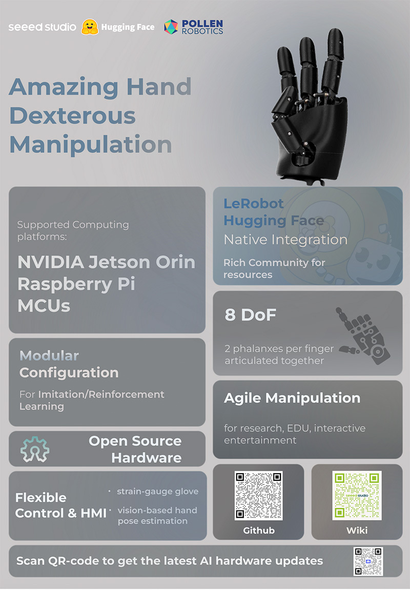 Amazing Hand 是一款採用 3D 列印技術製造的開源人形手,擁有 8 個自由度和四個手指。它採用全內部驅動,重量輕(400 克),成本低廉,並配備柔性外殼,可實現自然流暢的運動。 Amazing Hand 集靈巧性、簡易性和易用性於一體,是科研、教育和機器人領域的理想之選。