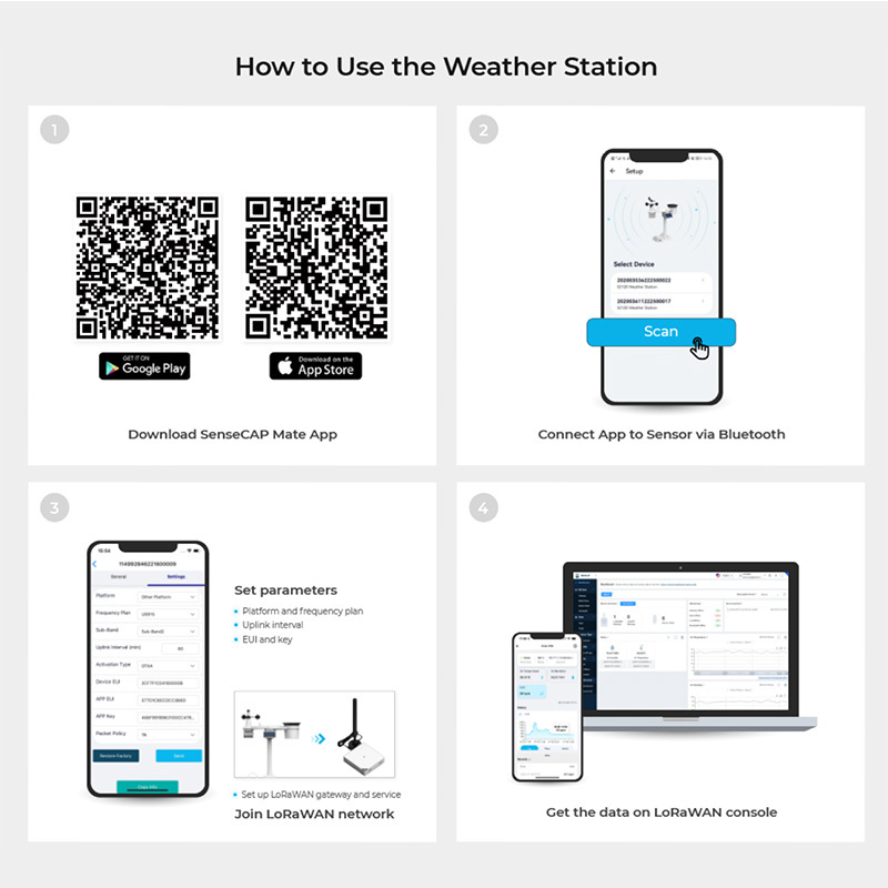 SenseCAP LoRaWAN S2120 氣象站可擷取並上傳全球 LoRaWAN 網路支援的氣溫、濕度、風速/風向、降雨強度、光照強度、紫外線指數和氣壓資料。 S2120 氣象站適用於花園、農業、氣象、都市環境監測等多種應用情境。此外,它還具有超低功耗、性能可靠、內建藍牙支援 OTA 配置和遠端設備管理等優點,從而降低了維護成本。