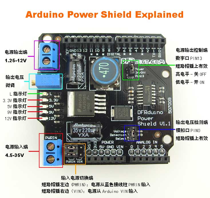 多數 Arduino 專案常需要超過兩種電壓輸出。這款 Arduino 電源擴展板可接受 4.5~35V 的輸入電壓,並提供 1.25~12V 可調輸出電壓,峰值電流達 3A,適合驅動伺服馬達或其他非標準元件。有了這塊電源擴展板,您的 Arduino 專案將能共用一組電源完成多種供電需求。