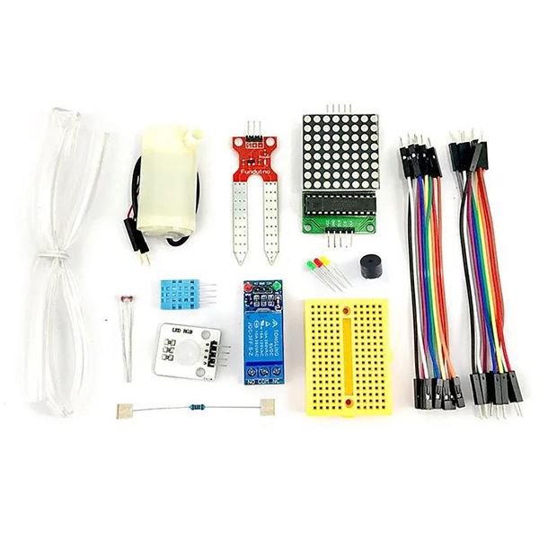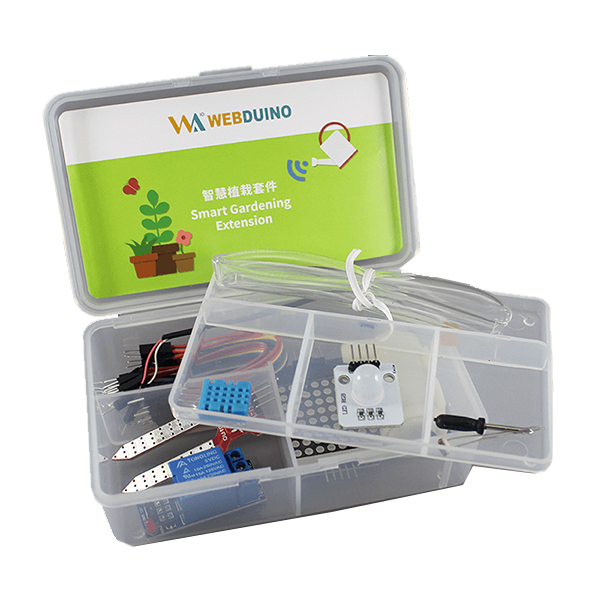 Webduino 智慧植栽套件是專門針對植物栽培的套件,內含繼電器、水泵、光敏電阻與土壤濕度偵測...等植栽專用零件組合,當土壤濕度不足時啟動水泵自動澆水,並透過溫濕度傳感器、光敏電阻偵測環境變化,隨時記錄或發送通知,透過 Webduino 智慧植栽套件讓種植作物更智慧!