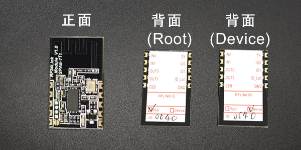 包含 1:1,1:2,1:3,1:4,多種規格讓使用者自由選擇購買,它能將傳統有線按鍵轉成無線, 並且輕易的升級成 1 對 4 的無線數位輸出入裝置(每個模組有兩對IO),除了使用ROOT 板上的ID0/ID1來選擇要傳輸的裝置,Device 上的ID0/ID1更讓使用者自行定義自己是#1~4中的哪一個裝置,讓您在開發各種裝置功能時,更加的彈性好用。