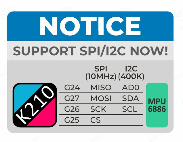 I2C單模式(藍色PCB)版本的M5StickV電路設計中,MPU6886僅支援用戶配置其通信模式為I2C,其引腳映射為SCL-28,SDA-29.